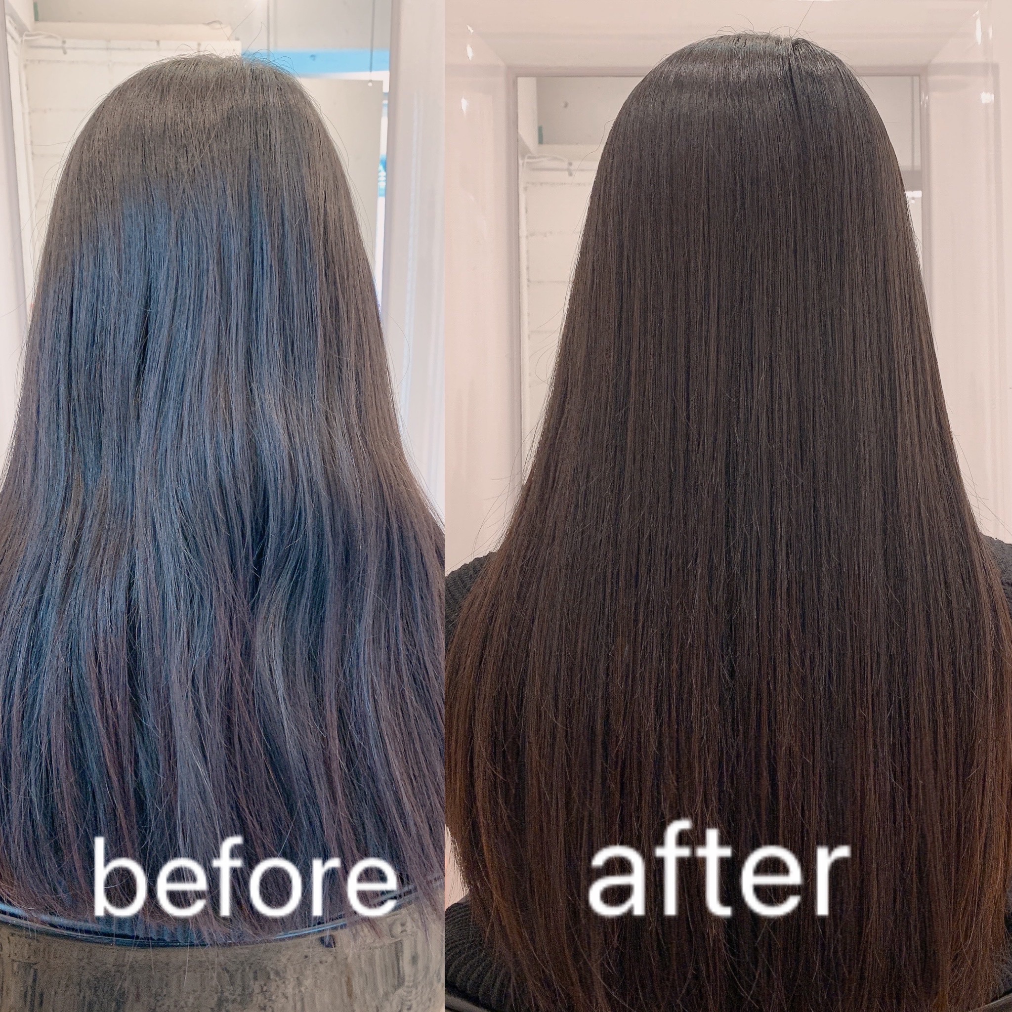 そこで今回は髪全体に髪質改善の栄養分とカラー剤を調合したお薬でカラーリングをしながら、髪質改善させて頂きました。